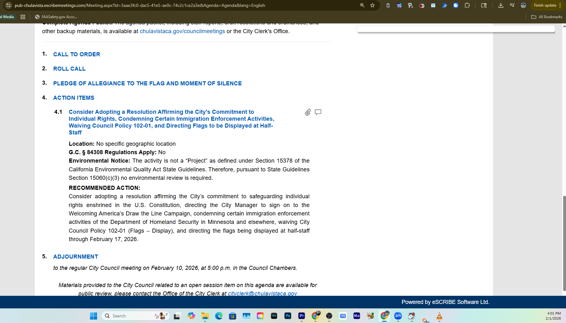 About a week later, a pertinent agenda item surfaced for a special city council meeting on February 2, 2026. This item proposes adopting a resolution affirming Chula Vista's commitment to individual rights, condemning certain immigration enforcement activities (including references to incidents in Minnesota involving the deaths of American citizens Renee Good and Alex Jeffrey Pretti), and directing the display of flags at half-staff through February 17, 2026.