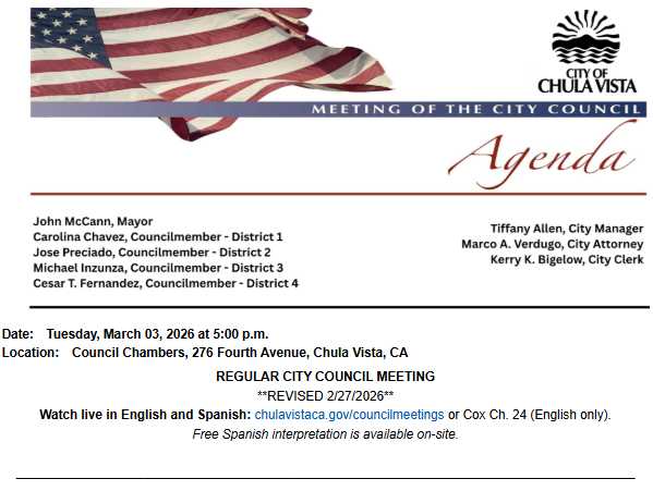 (Revised Agenda – 2/27/2026)Chula Vista residents — the City Council is back in the Chambers this Tuesday evening for its first regular meeting of March. The agenda covers routine business, a major library construction contract, new public safety technology, and a first reading of a new ordinance focused on due process and safety in city facilities.How to Watch & Participate